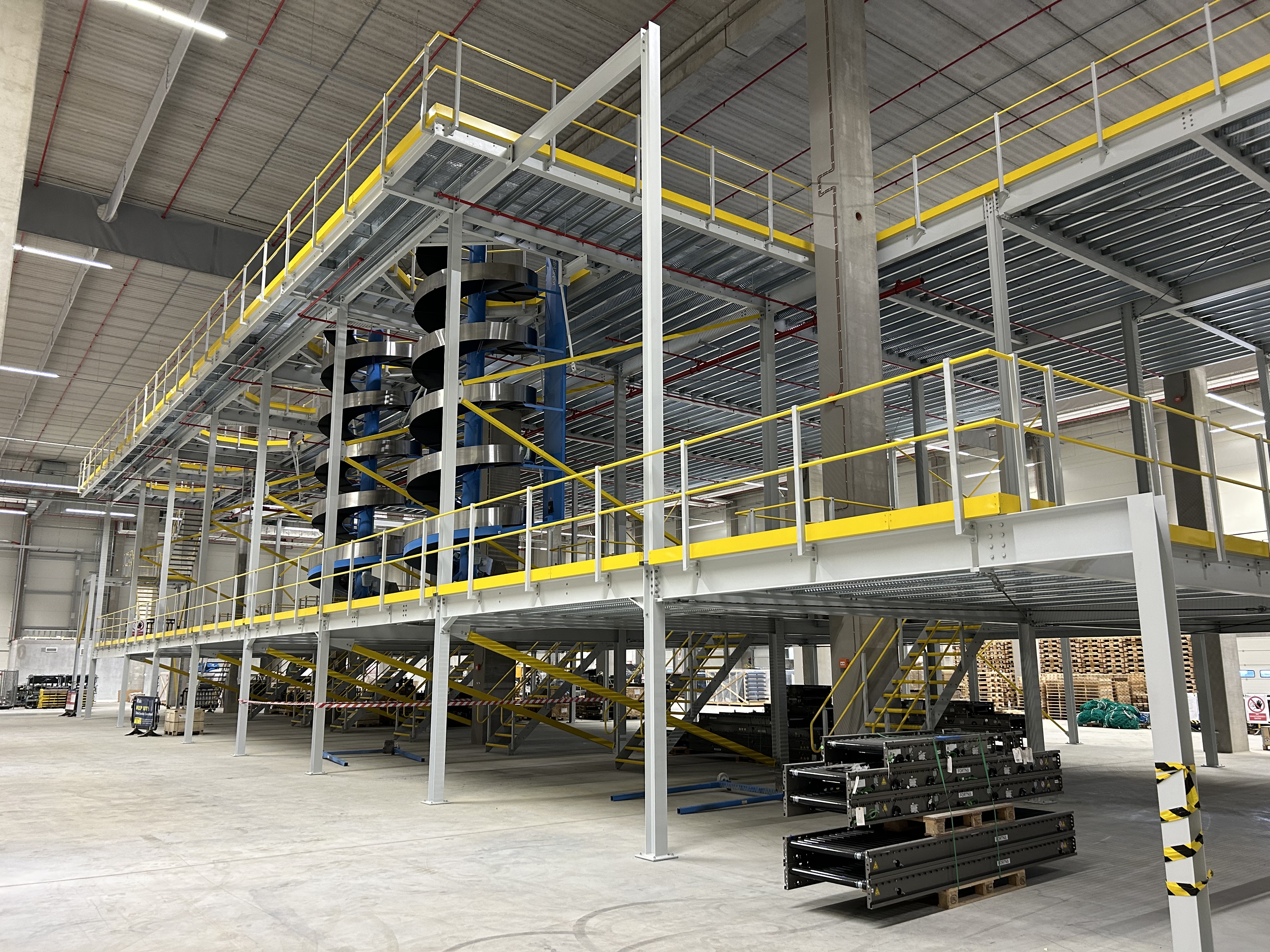 While the AutoStore system alone occupied around 12,000 sq m and supported more than 500,000 totes and 2,500 robots, MiTek’s scope extended far beyond that. In Hall 3, the team built a mezzanine floor dedicated to hanging garment automation, and in Hall 4, a two-tier mezzanine was integrated to support conveyor lines and spiral chutes. Across the site, platforms were constructed on multiple levels – four, nine and 15 metres – with certain beams weighing up to 1.7 tonnes each, necessitating the use of specialist lifting equipment. MiTek installed a total of 32,000 sq m of mezzanine across the various levels.
